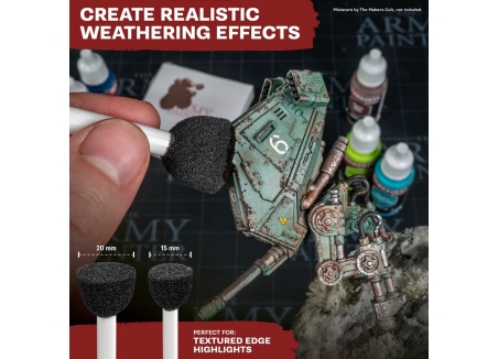 Precision foam tips make it easy to place fine scratches, edge wear, and clustered chips with repeatable control. Ideal for armour plates, weapons, helmets, and compact panels.