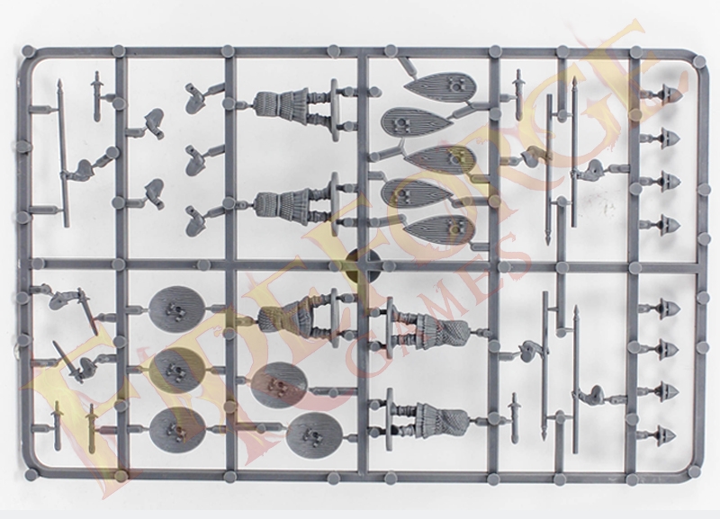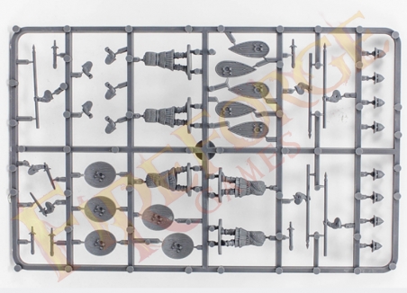 This box enables you to build 25 Byzantine Skoutatoi in heavy armour. You'll be able to build 25 Spearmen, or up to 10 armed with sword and 15 with spear. All the figures in the box can be assembled with two different types of shields, building early or later period byzantines.