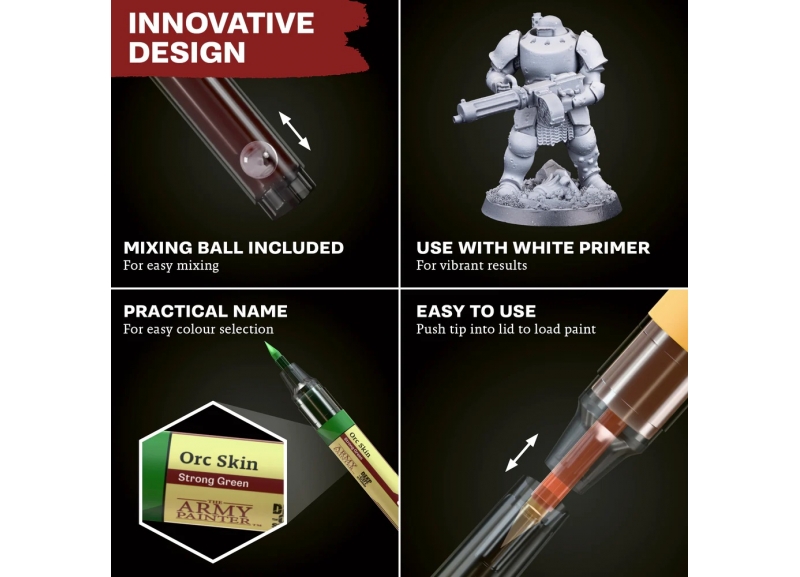 With Speedpaint Markers, you hold an entire hobby in your hands. With the release of Speedpaint Marker singles, you can experiment with a new way to paint and push the boundaries of your hobby. Try Speedpaint Markers with 20 ultra-rich colours that make painting easier than ever. Without a brush or palette, you can switch between colours in a heartbeat and take your hobby wherever you go. Our innovative Felt-Tech tip technology combines precision and even pigment distribution—cover large surfaces or paint the smallest details. Reimagine your hobby.