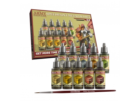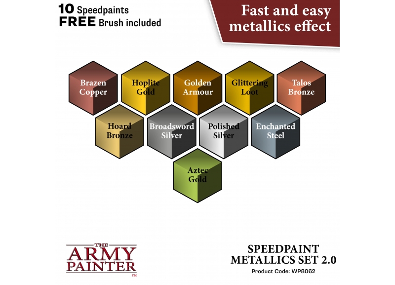 Our revolutionary new Speedpaints Metallics are the easiest way to get metallic effects on your miniatures in one simple application. Speedpaint Metallics are the hobby’s first-ever metallic one-coat painting solution, and this paint set is the fastest way to get your hands on all ten! With colours ranging from rich Talos Bronze, to shimmering Broadsword Silver, and glimmering Hoplite Gold – you have the perfect metallic selection for your hordes of plate mail, carapace, and armour.