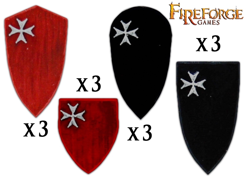 This pack contains 12 shields, in fine resin, 4 different shapes (3 kite and 1 heater) with embossed symbols. You can use them with our figures to built up military order knights/infantry.